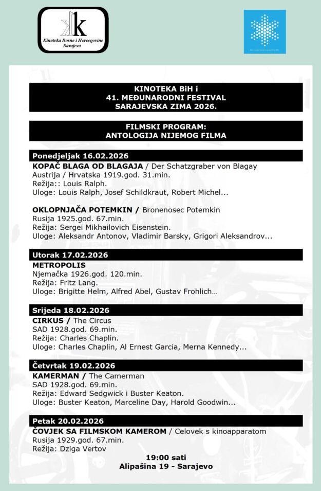 Kinoteka Bosne i Hercegovine u saradnji sa festivalom Sarajevska zima organizuje projekcije nijemih filmova u okviru programa Antologija nijemog filma, donoseći publici priliku da na velikom platnu doživi klasike koji su oblikovali historiju sedme umjetnosti.